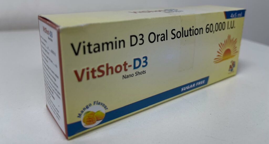 VitShot is a sugar-free, mango-flavored supplement containing 60,000 IU of Cholecalciferol (Vitamin D3). VitShotD3 helps in the absorption of calcium and phosphate from food, which is essential for maintaining healthy bones and teeth. It is also beneficial in reducing muscle pain, fatigue, and stress, as well as preventing Vitamin D and calcium deficiencies